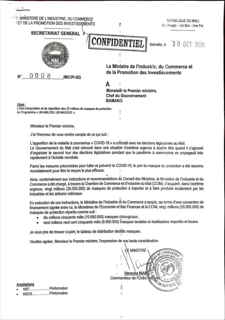 Les 20 millions de masques rentraient dans le cadre de l’exécution du programme présidentiel « Un Malien, un masque », lancé en 2020 sous la présidence d’Ibrahim Boubacar Keïta (IBK). Le programme avait pour but de fournir gratuitement à la population malienne 10 millions 50 000 masques chirurgicaux et 9,950 millions masques lavables et réutilisables, pour un montant total de 10,9 milliards de nos francs. L’ensemble de la commande des 20 millions de masques a été faite auprès de fournisseurs étrangers et locaux sous la supervision de la CCIM, en partenariat avec son ministère de tutelle. Les masques ont bien été réceptionnés et distribués, comme l’a confirmé le BVG à l’époque. Néanmoins, l’enquête avait mis en lumière des irrégularités dans les procédures administratives et financières, notamment en matière d’enregistrement des contrats et de paiement de certains droits, malgré un arrêté ministériel prévoyant des exonérations.